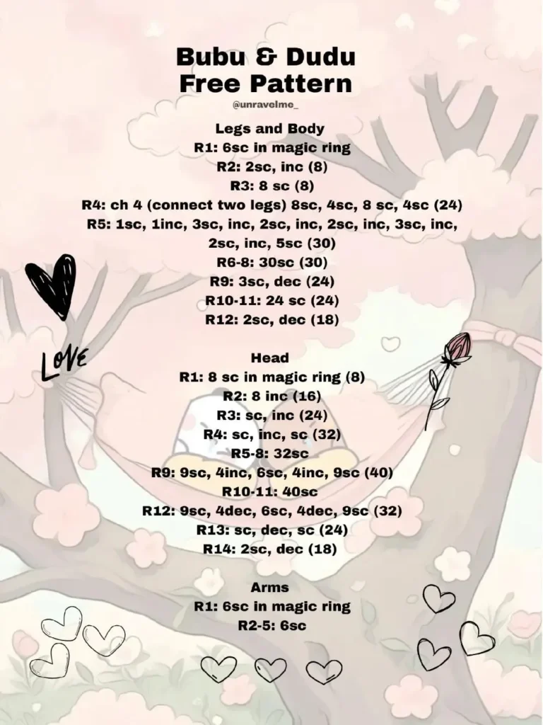 | R4 | ch 4 (connect two legs) 8 sc, 4 sc, 8 sc, 4 sc | (24) |