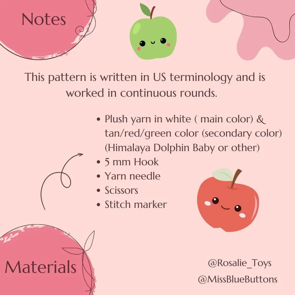 - Yarn: Plush yarn in White (main color for the flesh) & Tan/Red/Green (secondary color for the peel). Designer used Himalaya Dolphin Baby.