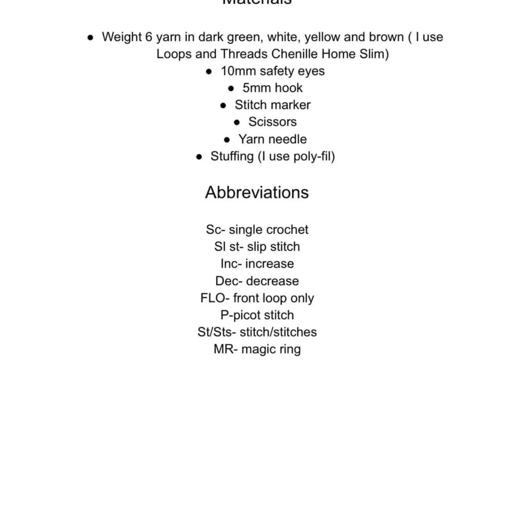 - Tools: Stitch marker, Scissors, Yarn needle, Stuffing (poly-fil).